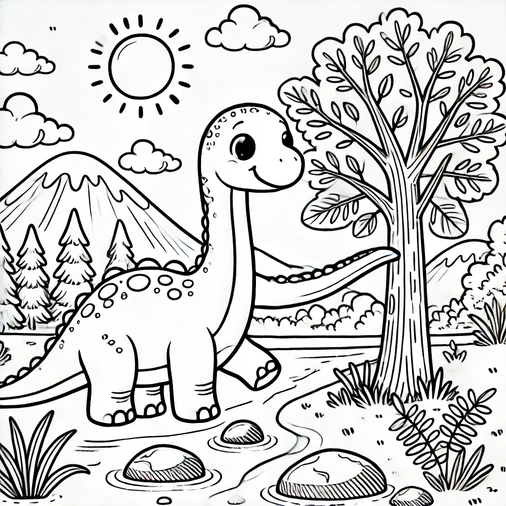 Dieses bezaubernde Ausmalbild zeigt einen fröhlichen Brachiosaurus, der in einer prähistorischen Landschaft steht, umgeben von Bäumen, Bueschen und einer strahlenden Sonne am Himmel.