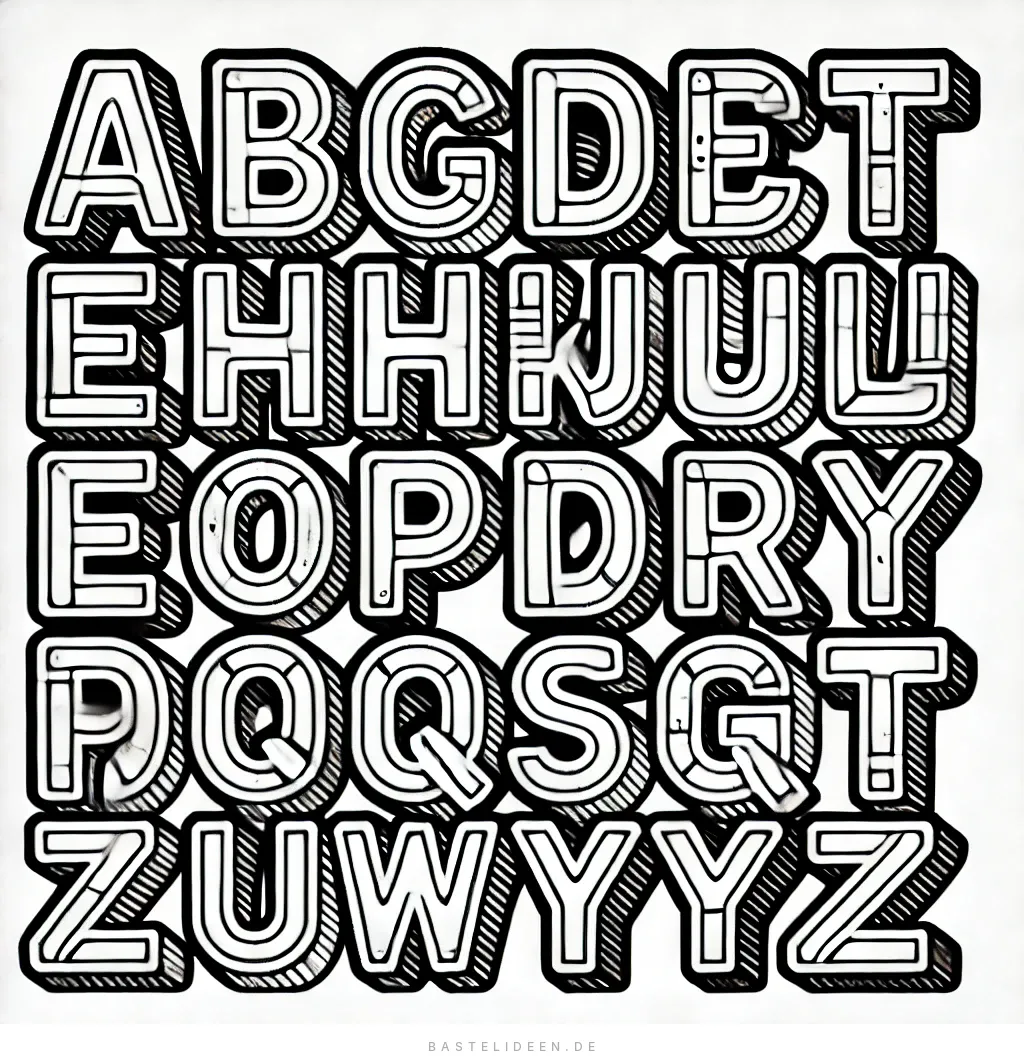 Auf diesem Bild findest Du ein auffälliges Alphabet mit fetten Blockbuchstaben, die ideal zum Ausmalen sind. Jeder Buchstabe hat eine dicke Umrandung und einen stilvollen 3D-Effekt, der Dir viel Platz für kreative Gestaltung bietet.