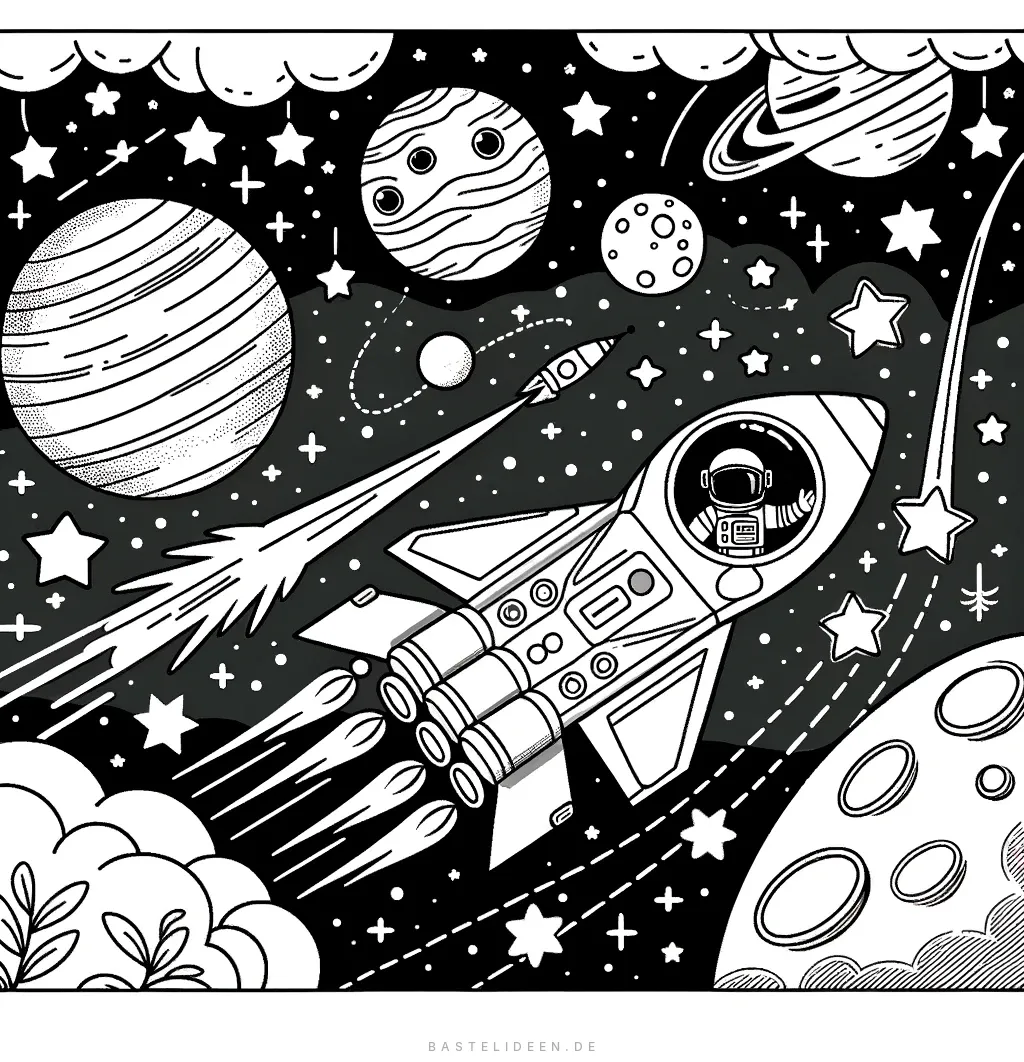 Das Bild zeigt ein aufregendes Weltraumabenteuer, mit einer Rakete, die durch eine sternenreiche Galaxie saust. Ein Astronaut winkt aus dem Fenster der Rakete, während Planeten, Sterne und Kometen die lebendige Szene des Weltraums füllen.