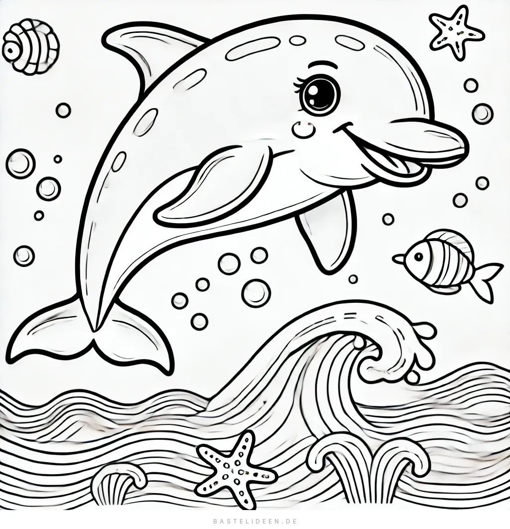 Dieses fröhliche Ausmalbild zeigt einen Delfin, der fröhlich mit seinen Meeresfreunden schwimmt. Umgeben von spielerischen Fischen, Seesternen, Muscheln und Blasen taucht der Delfin durch die Wellen und bringt die Schönheit des Ozeans auf die Seite.