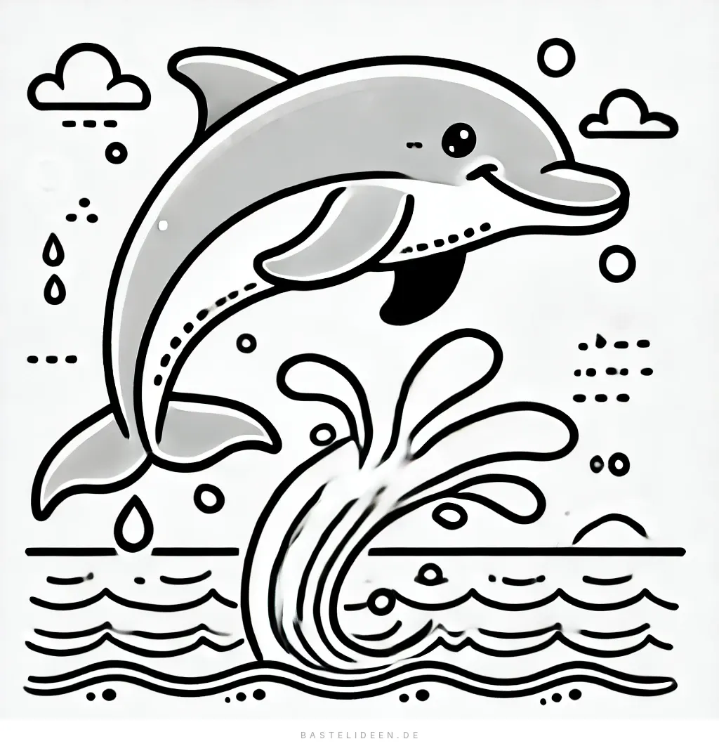 Dieses bezaubernde Ausmalbild zeigt einen fröhlichen Delfin, der mit einem großen Sprung aus dem Wasser springt.