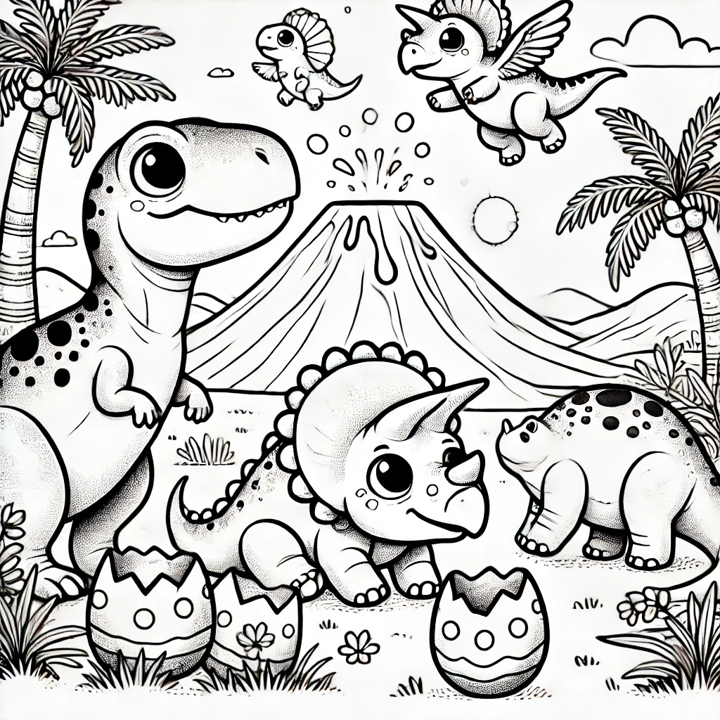 Dieses verspielte Ausmalbild zeigt niedliche Baby-Dinosaurier in einer prähistorischen Landschaft mit einem ausbrechenden Vulkan im Hintergrund.