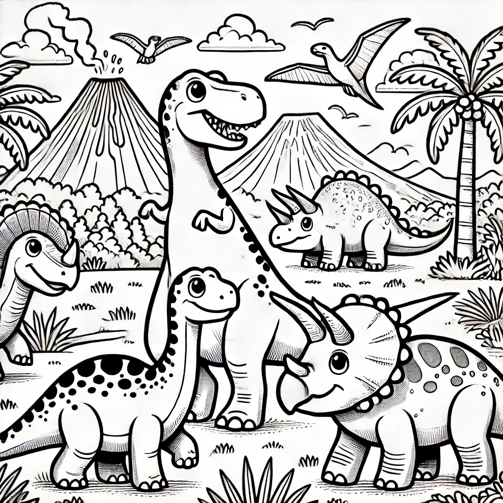 Dieses spannende Ausmalbild erweckt die prähistorische Welt der Dinosaurier zum Leben! Mit einer Gruppe freundlicher Dinosaurier, darunter der mächtige T-Rex, der niedliche Triceratops und viele weitere Dinosaurier, bietet die Szene einen Hintergrund mit Vulkanen und Palmen.