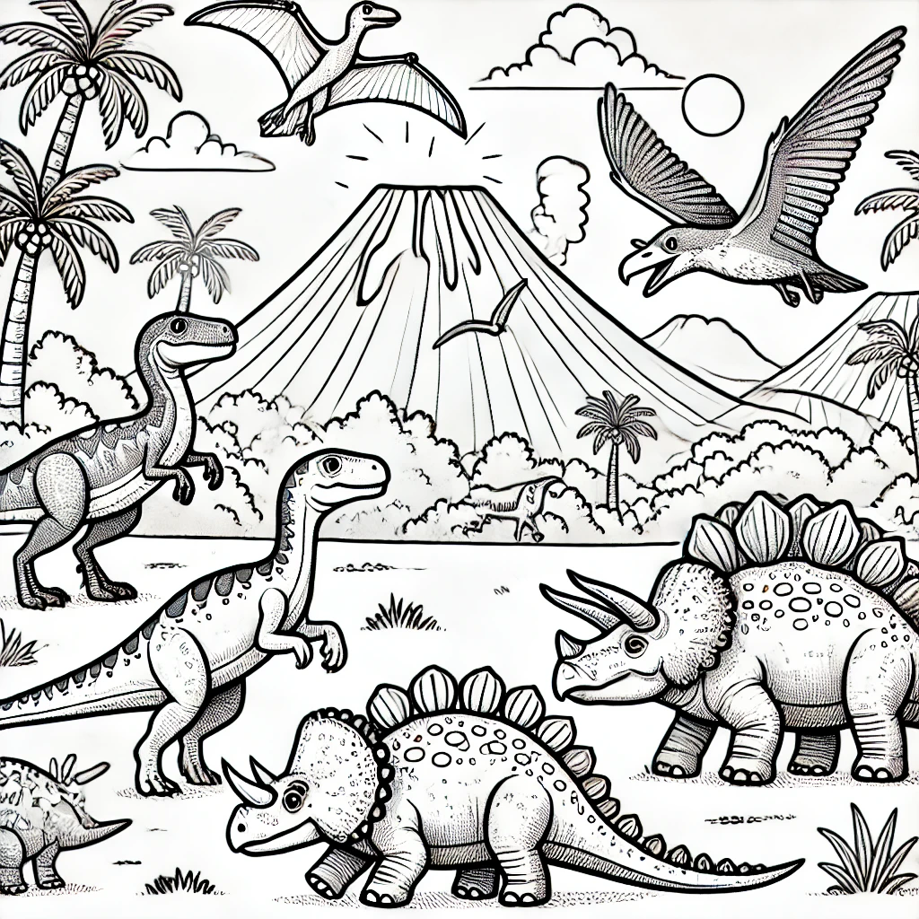 Dieses faszinierende Ausmalbild zeigt eine lebendige Szene aus der prähistorischen Zeit, in der Dinosaurier wie der Triceratops, Stegosaurus und Velociraptor vor einem dramatischen Vulkan umherstreifen.