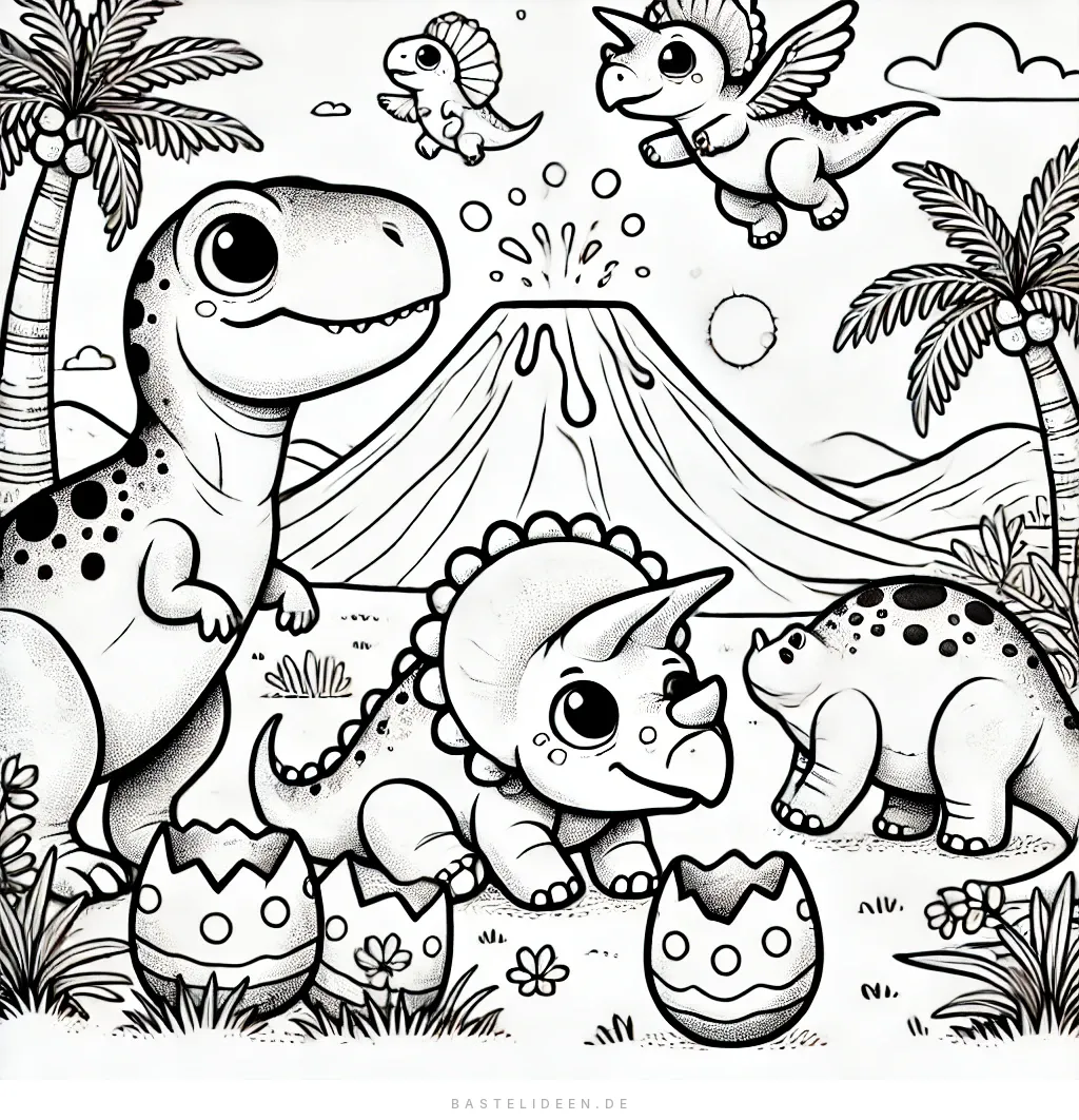 Dieses verspielte Ausmalbild zeigt niedliche Baby-Dinosaurier in einer prähistorischen Landschaft mit einem ausbrechenden Vulkan im Hintergrund.