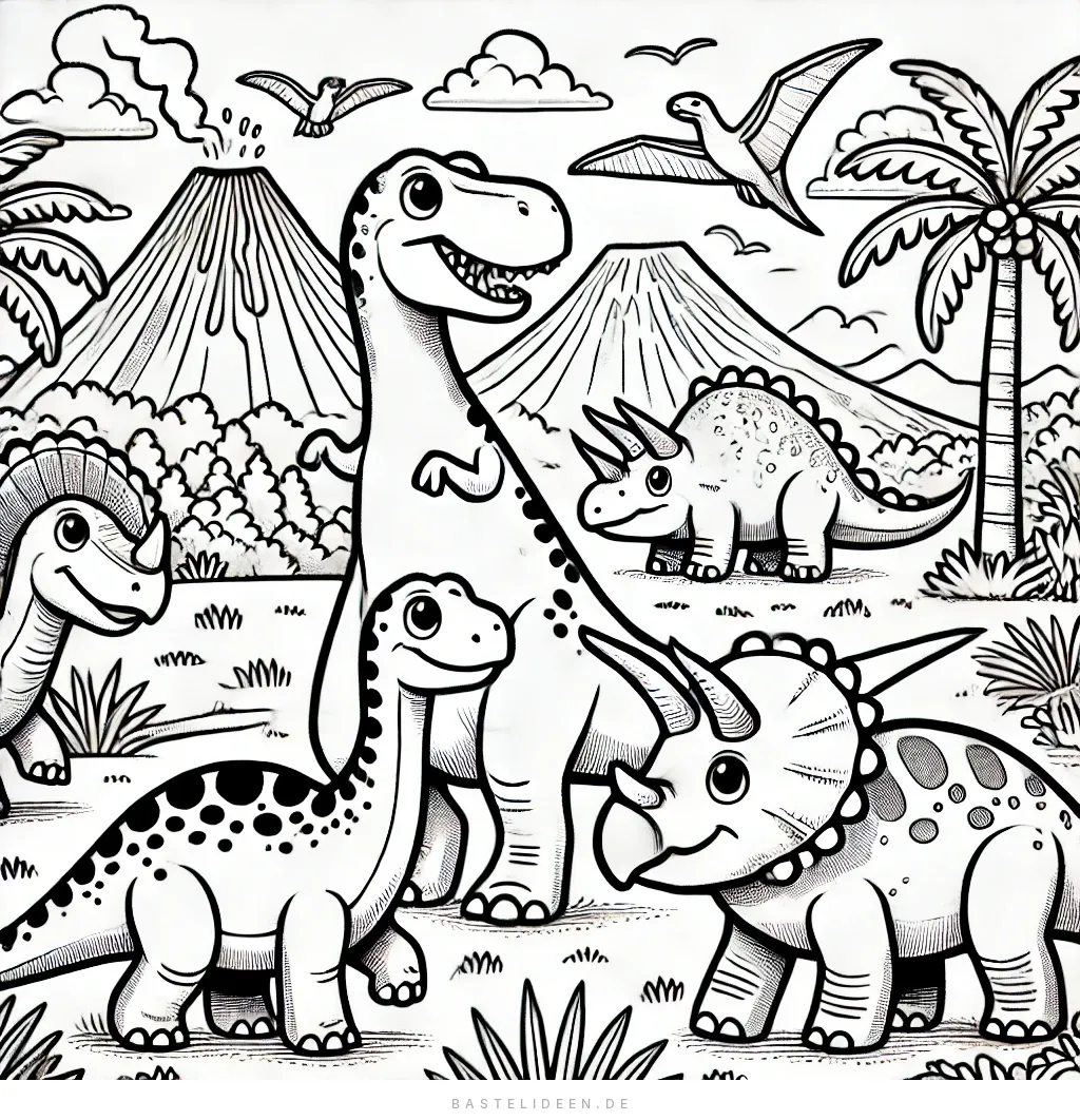 Dieses spannende Ausmalbild erweckt die prähistorische Welt der Dinosaurier zum Leben! Mit einer Gruppe freundlicher Dinosaurier, darunter der mächtige T-Rex, der niedliche Triceratops und viele weitere Dinosaurier, bietet die Szene einen Hintergrund mit Vulkanen und Palmen.