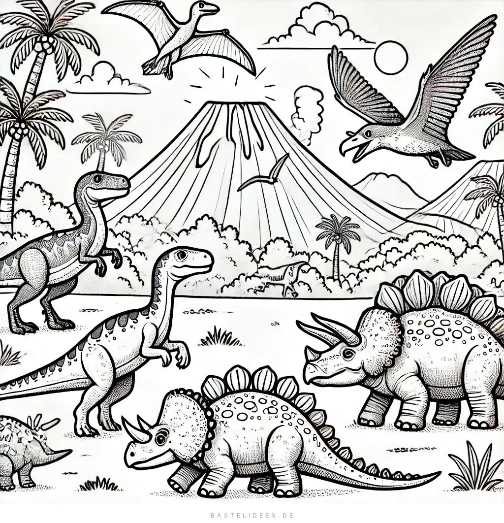 Dieses faszinierende Ausmalbild zeigt eine lebendige Szene aus der prähistorischen Zeit, in der Dinosaurier wie der Triceratops, Stegosaurus und Velociraptor vor einem dramatischen Vulkan umherstreifen.