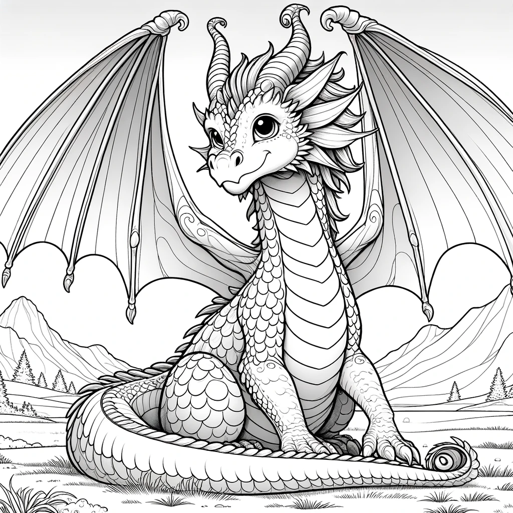 Betrete eine mythische Welt mit unseren Drachen-Ausmalbildern! Dieses bezaubernde Bild zeigt einen freundlichen Drachen mit majestätischen Flügeln und komplexen Schuppen, vor einer Kulisse ruhiger Berge. Es ist die perfekte Mischung aus Fantasie und Ruhe für Künstler jeden Alters.