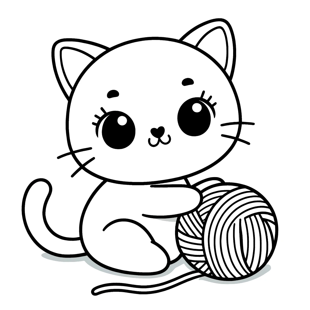 Das Bild zeigt ein niedliches Kätzchen mit großen, ausdrucksvollen Augen, das verspielt ein Wollknäuel hält. Der süße Ausdruck des Kätzchens und das einfache, aber charmante Design machen diese Illustration perfekt für junge Künstler und Katzenliebhaber.