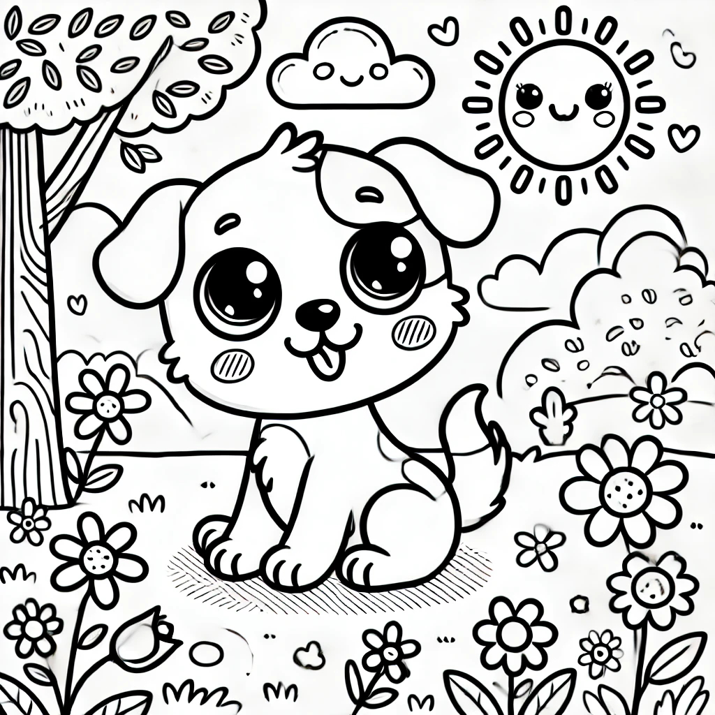 Diese bezaubernde Ausmalbild zeigt einen niedlichen Cartoon-Hund, der fröhlich in einer heiteren Outdoor-Szene sitzt. Der Hund, mit seinen großen, ausdrucksvollen Augen und wedelndem Schwanz, bringt Freude und Verspieltheit ins Bild.