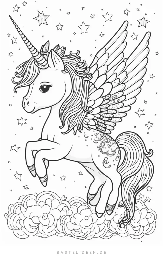 Traumhaftes Ausmalbild eines geflügelten Einhorns zwischen Sternen, geeignet für Kinder ab 6 Jahren.