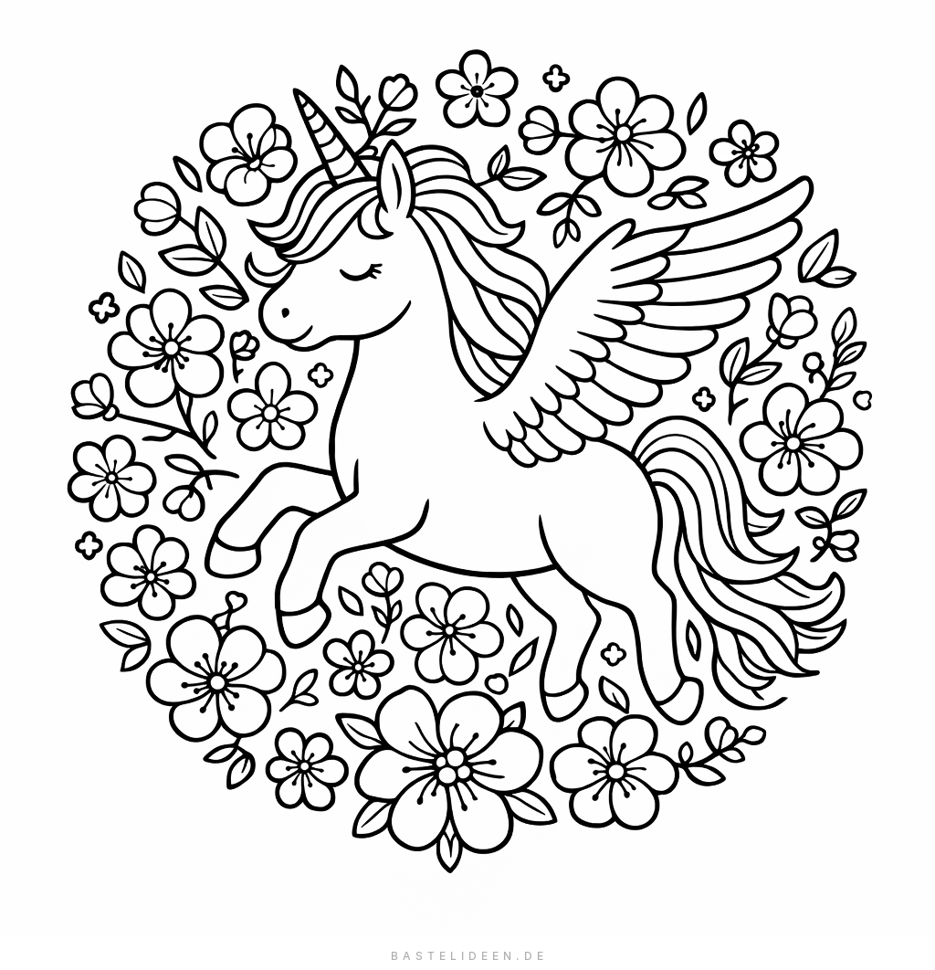 Liebliches Ausmalbild eines Einhorns mit Flügeln in Blumenpracht, für Kinder ab 6 Jahren.