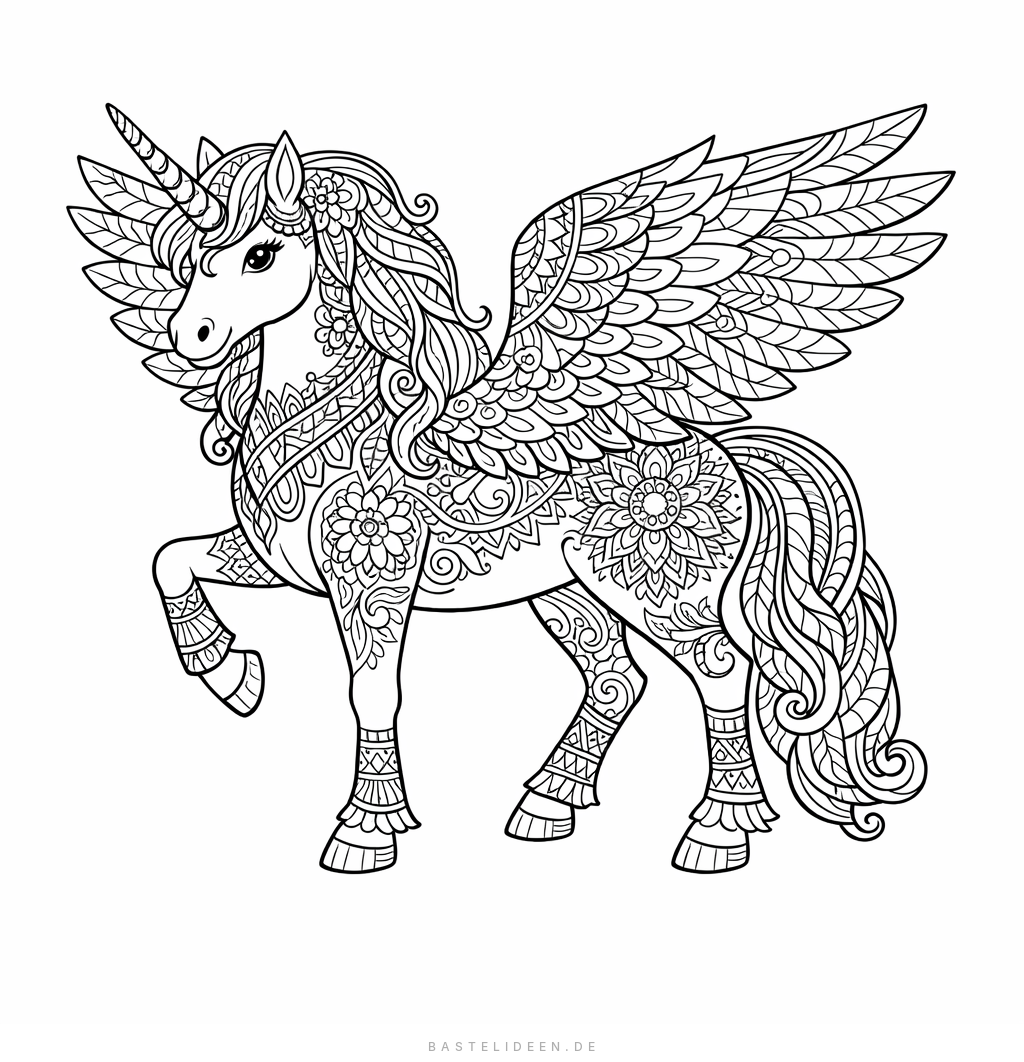 Für Erwachsene: Kunstvolle Ausmalbilder mit komplexen Mustern – von Einhorn-Flügel-Mandalas über ornamental verzierte Pegasus-Einhörner bis zu Zentangle-Designs mit floralen Elementen.