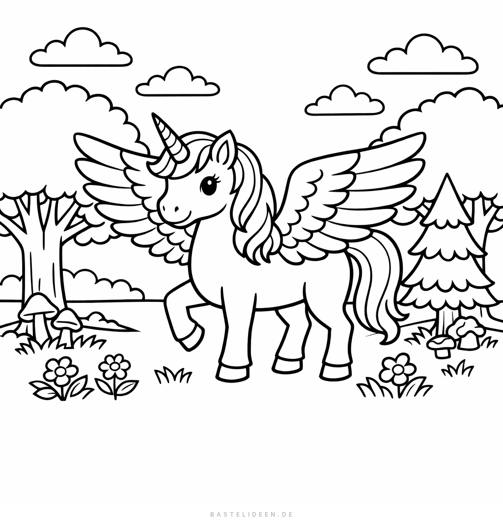 Fantastisches Ausmalbild eines Pegasus-Einhorns im Zauberwald, ideal für Schulkinder ab 6 Jahren.