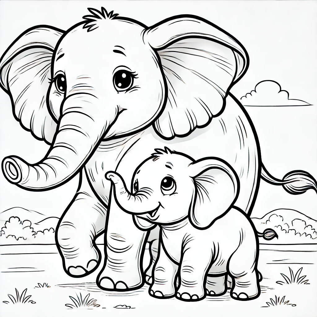 Dieses herzerwärmende Ausmalbild zeigt eine liebevolle Elefantenmama, die Seite an Seite mit ihrem Baby läuft und ihre starke Bindung demonstriert.