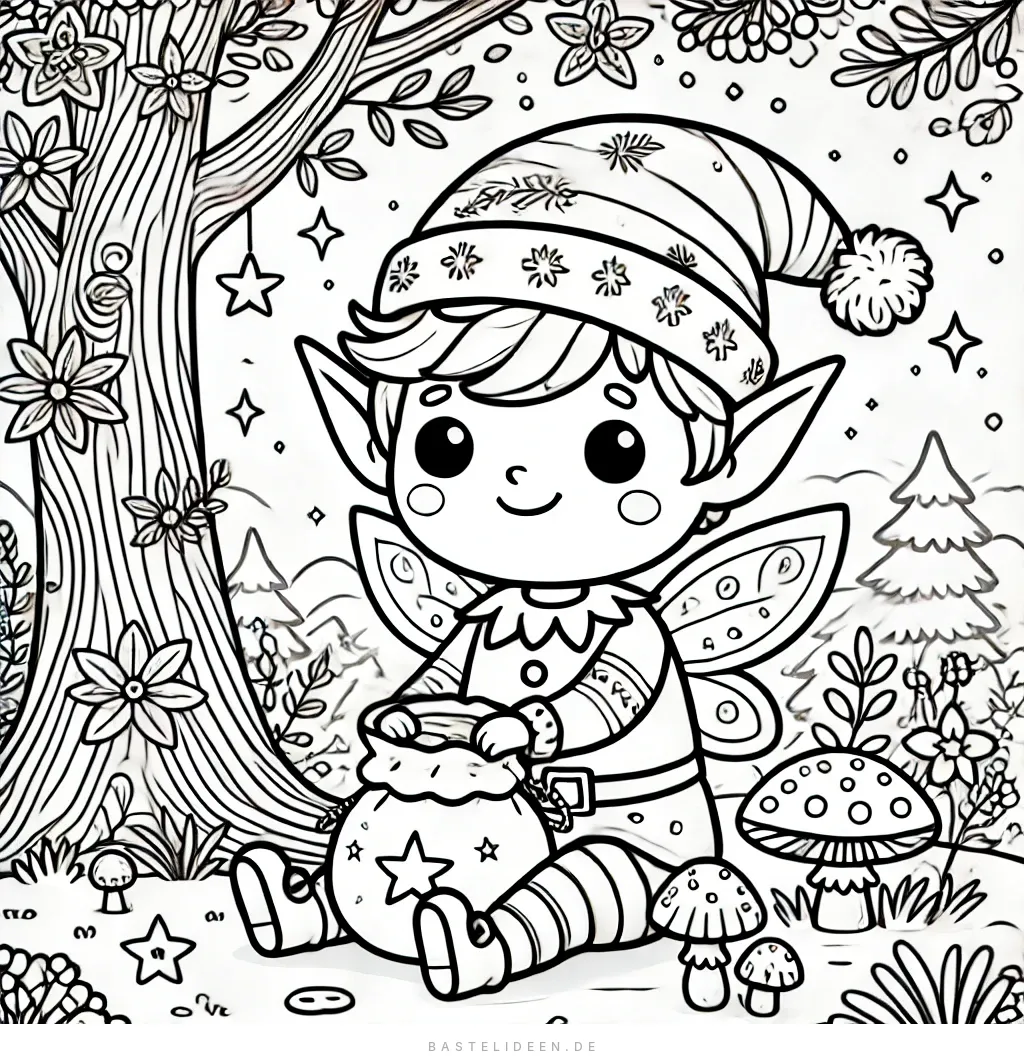 Dieses bezaubernde Ausmalbild zeigt einen charmanten Elf mit spitzen Ohren und einem festlichen Hut, der unter einem magischen Baum sitzt. Der Elf, mit einem fröhlichen Ausdruck, hält ein kleines, mit Sternen verziertes Säckchen.