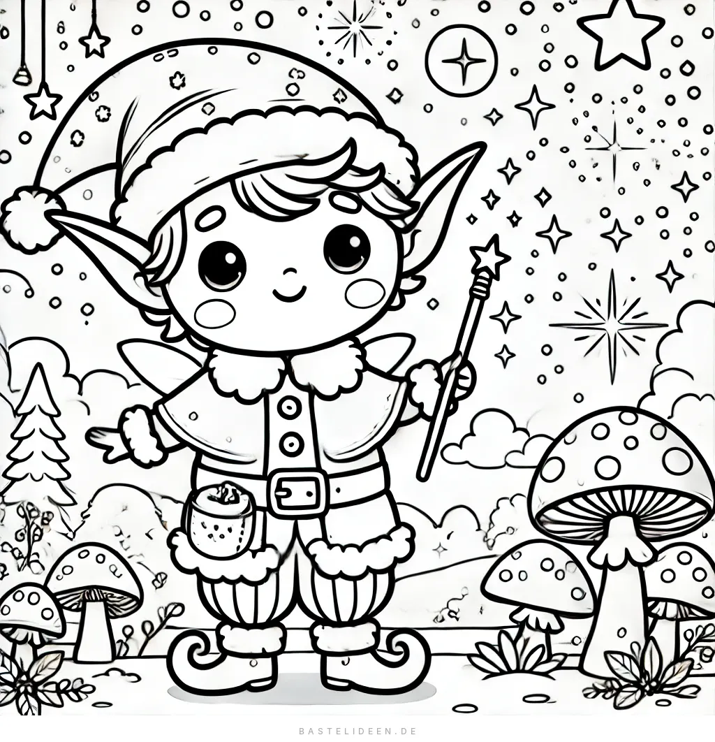 Diese bezaubernde Ausmalbild zeigt einen niedlichen Elf in einem festlichen Outfit, komplett mit einem Hut und einem Zauberstab. Der Elf steht fröhlich inmitten einer fantasievollen Szene, die mit funkelnden Sternen, magischen Pilzen und einem ruhigen Waldhintergrund gefüllt ist.