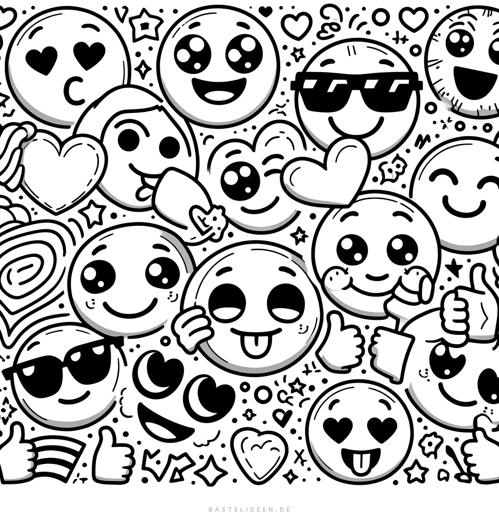 Dieses lebhafte Ausmalbild ist mit einer Vielzahl ausdrucksstarker Emojis gefüllt, die verschiedene Emotionen und spielerische Designs zeigen. Von Herzaugen und großen Lächeln bis hin zu coolen Sonnenbrillen und Daumen hoch.