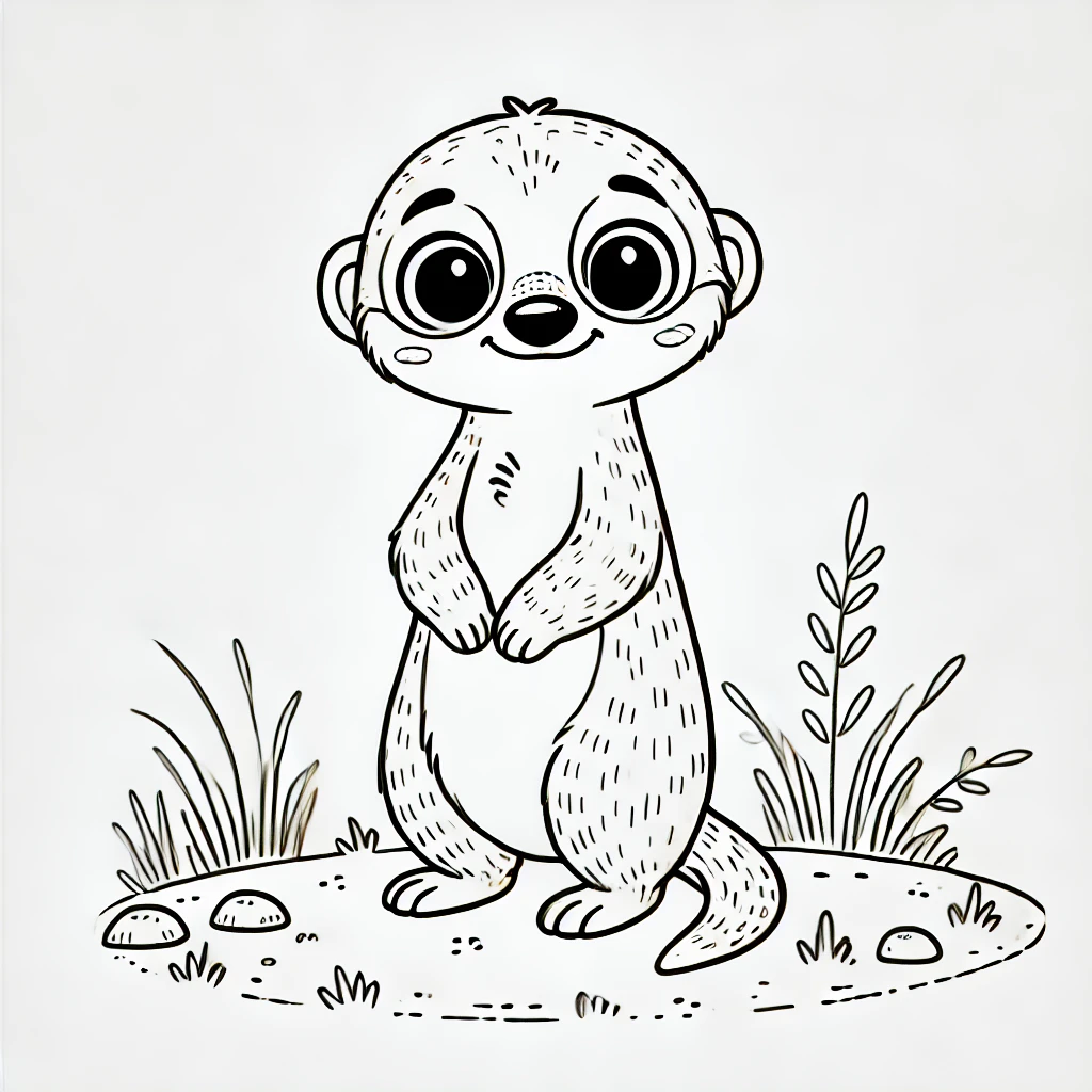 Auf dieser niedlichen Malvorlage steht ein süßes Erdmännchen aufrecht auf einem kleinen Stück Land, umgeben von Pflanzen und Steinen. Mit seinen großen runden Augen und dem freundlichen Lächeln lädt das Erdmännchen dazu ein, farbenfroh gestaltet zu werden.
