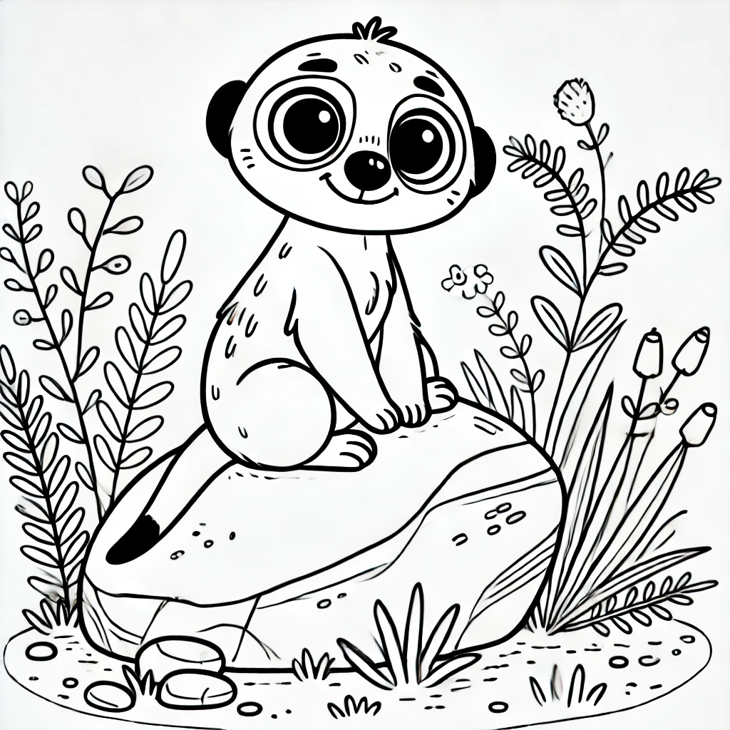 Auf dieser entzückenden Malvorlage sitzt ein verspieltes Erdmännchen fröhlich auf einem großen Felsen, umgeben von verschiedenen Pflanzen und Blumen. Mit seinen großen, leuchtenden Augen und seinem fröhlichen Gesichtsausdruck lädt es zum Ausmalen ein.