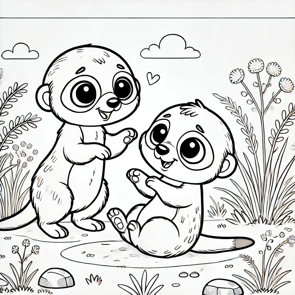 Diese niedliche Malvorlage zeigt zwei fröhliche Erdmännchen, die in einer blühenden Umgebung voller Pflanzen und Blumen miteinander spielen. Mit großen, ausdrucksvollen Augen strahlen die Erdmännchen Freundschaft und Freude aus.