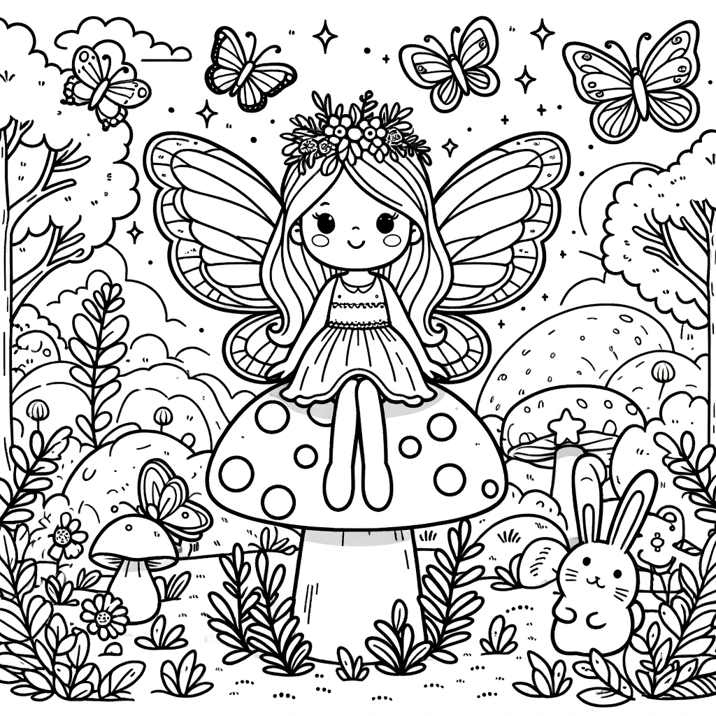 Tauche ein in eine magische Welt mit diesem bezaubernden Ausmalbild mit einer Fee! Es zeigt eine niedliche Fee, die auf einem Pilz sitzt, umgeben von Schmetterlingen, Blumen und fantasievollen Waldelementen.