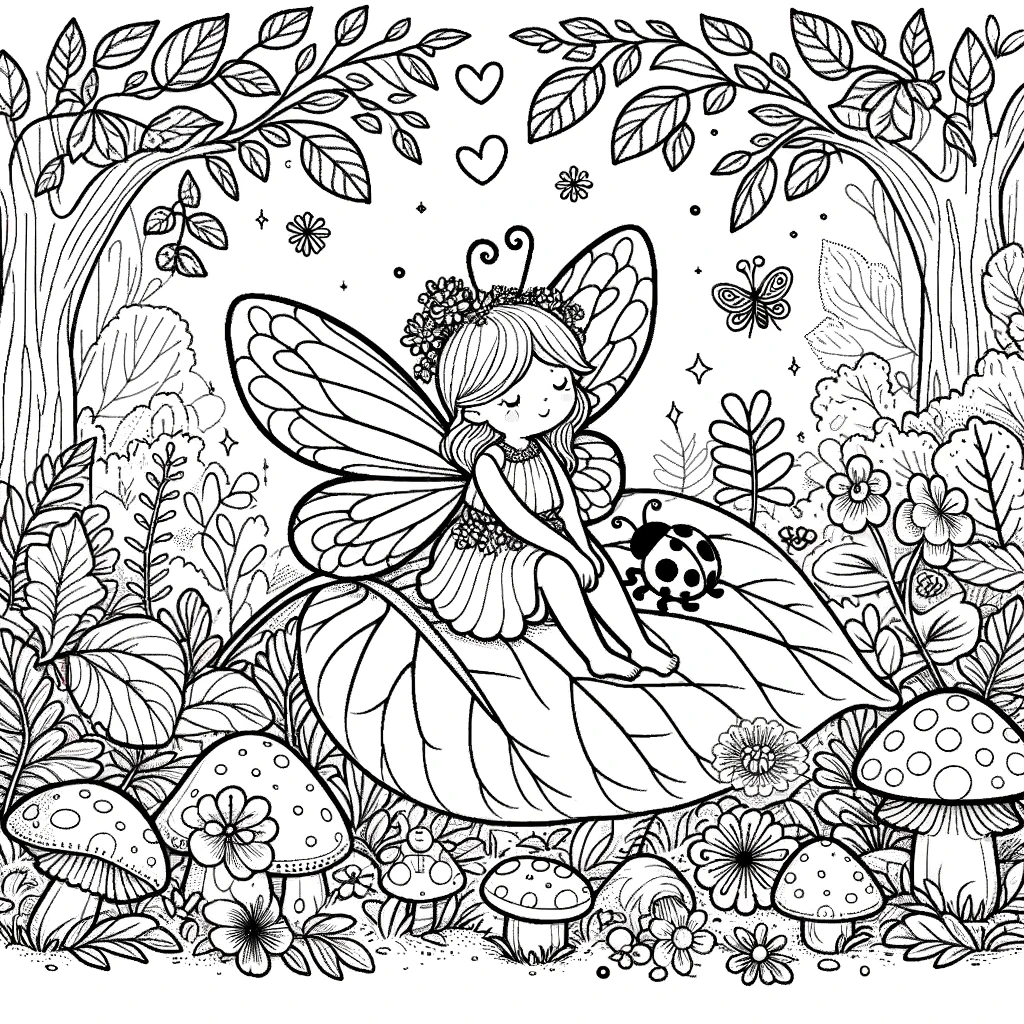 Tauche ein in eine verträumte Welt mit diesem bezaubernden Feen-Ausmalbild! Es zeigt eine friedliche Fee, die auf einem Blatt ruht, umgeben von üppigem Laub, Pilzen und einem freundlichen Marienkäfer.