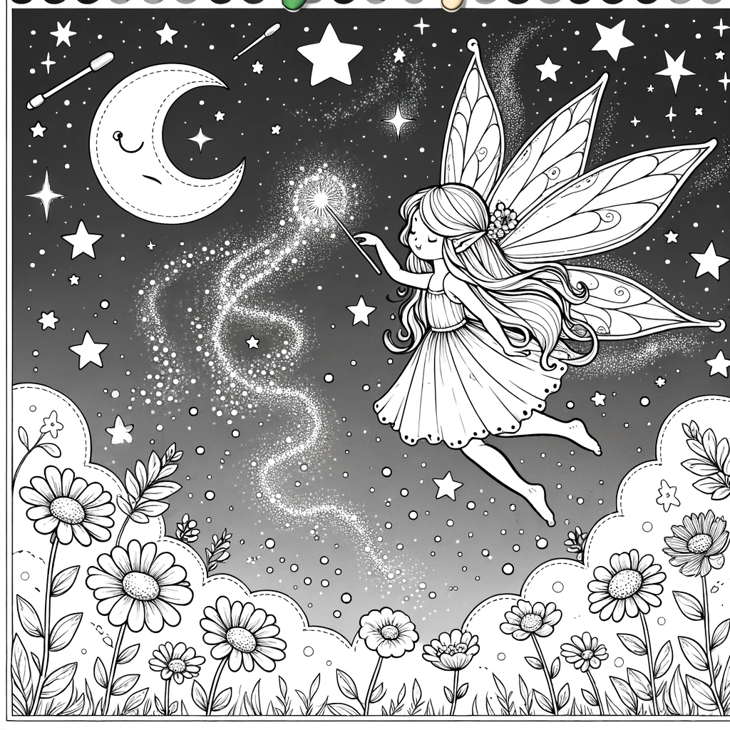 Begib dich auf eine magische Reise mit diesem bezaubernden Ausmalbild mit einer Fee! Es zeigt eine anmutige Fee, die durch einen sternenklaren Nachthimmel fliegt und mit ihrem Zauberstab Magie wirkt.