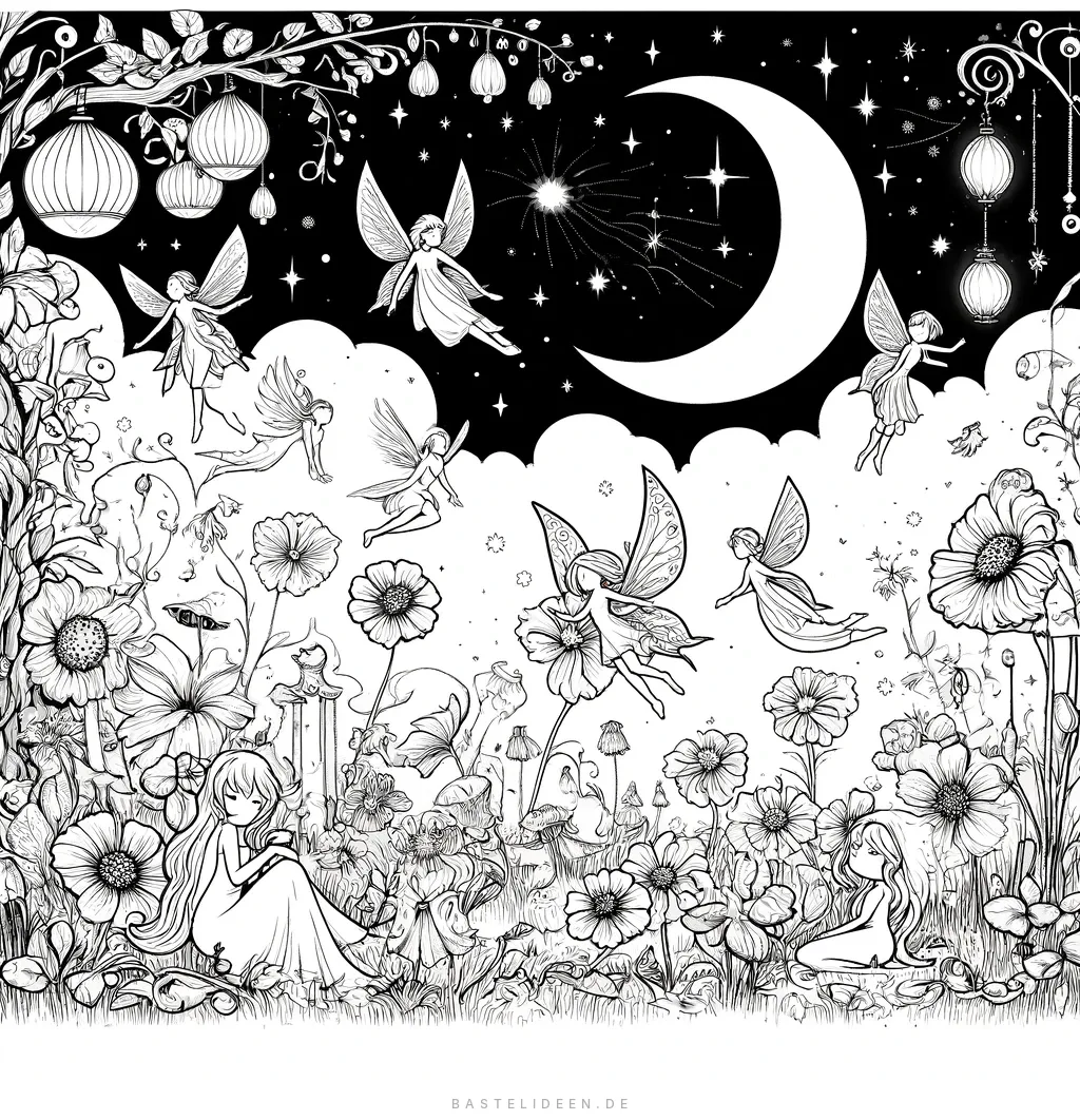 Dieses bezaubernde Ausmalbild zeigt einen mystischen Feen-Garten bei Nacht, beleuchtet von einem Halbmond und funkelnden Sternen. Feen mit zarten Flügeln flattern zwischen den Blumen und dem Laub, während einige friedlich sitzen und die ruhige Nacht genießen.