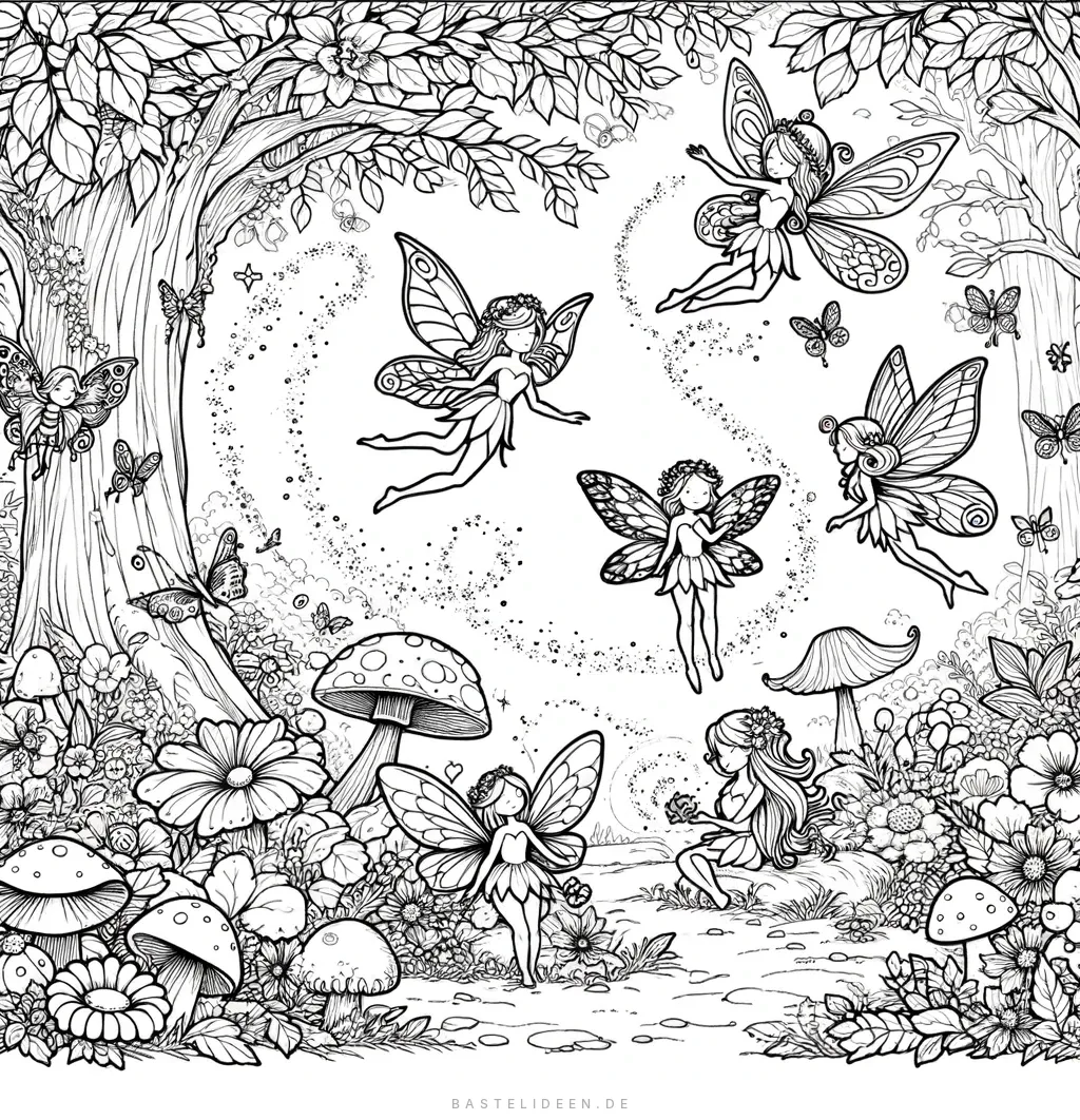 Dieses magische Ausmalbild zeigt ein bezauberndes Feen-Wunderland, voller verspielter Feen und lebendiger Flora. Die Szene zeigt Feen mit zarten Flügeln, die um eine Waldlichtung mit hohen Pilzen, blühenden Blumen und üppigem Grün flattern.