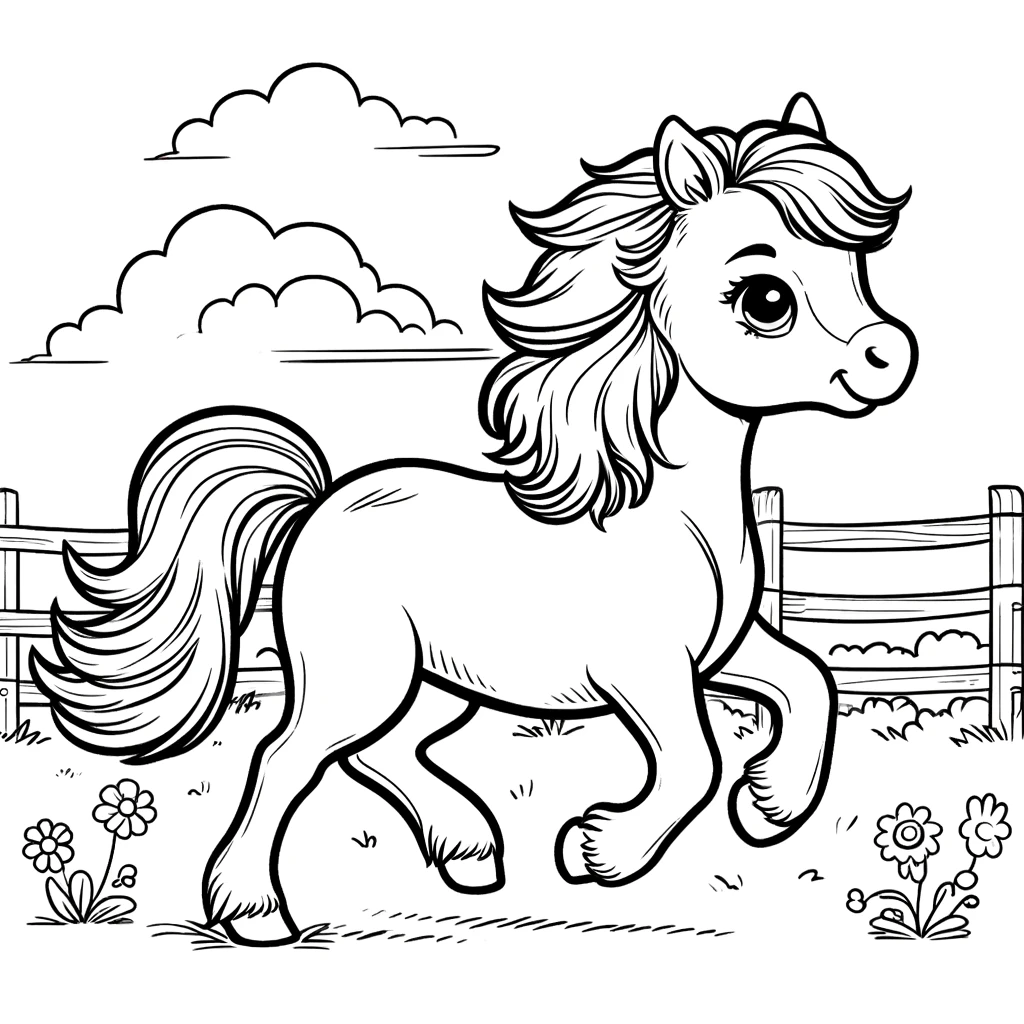 Auf diesem bezaubernden Ausmalbild galoppiert ein verspieltes Filly Pferde fröhlich durch eine Wiese, während seine Mähne und sein Schweif im Wind wehen. Umgeben von Blumen und einem Holzzaun im Hintergrund, lädt dich diese Szene dazu ein, sie mit leuchtenden Farben zum Leben zu erwecken.