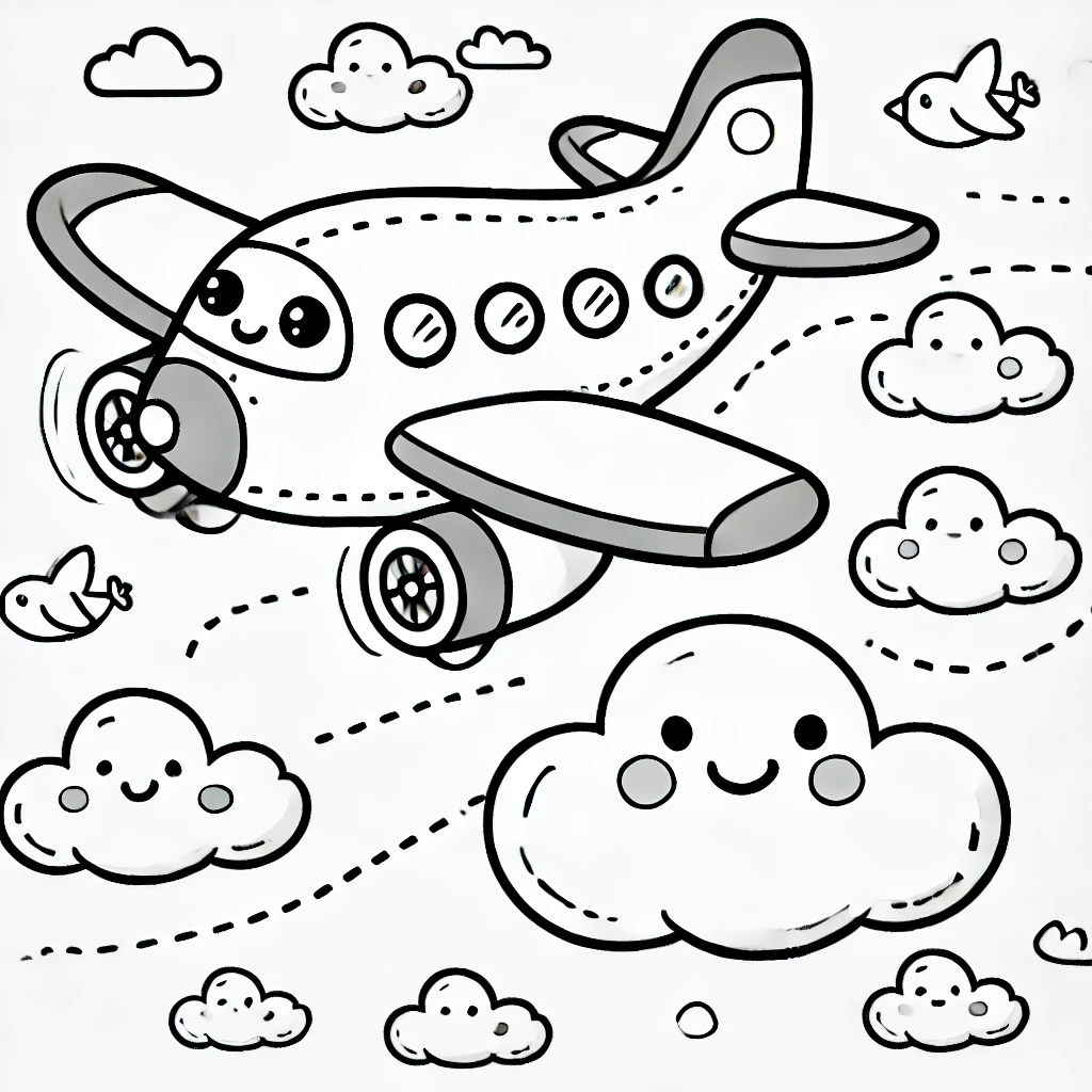Auf diesem niedlichen Ausmalbild fliegt ein lächelndes Flugzeug durch den Himmel, umgeben von fröhlichen Wolken und kleinen Vögeln, die es begleiten. Die verspielten Gesichter der Wolken und des Flugzeugs machen dieses Motiv perfekt für Kinder, die ihrer Kreativität freien Lauf lassen wollen.