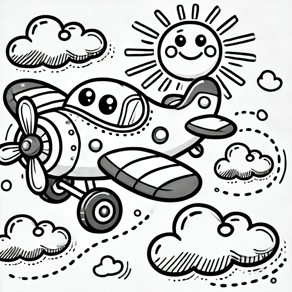 Auf diesem fröhlichen Ausmalbild fliegt ein freundliches Propellerflugzeug durch den Himmel, begleitet von lächelnden Wolken und einer strahlenden Sonne. Das Flugzeug und die verspielte Szenerie laden junge Künstler dazu ein, kreativ zu werden und Spaß am Malen zu haben.