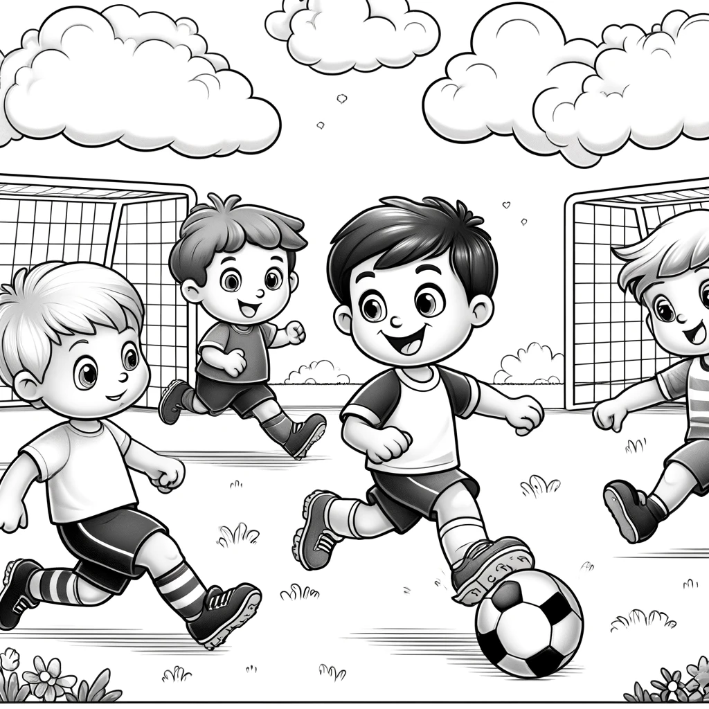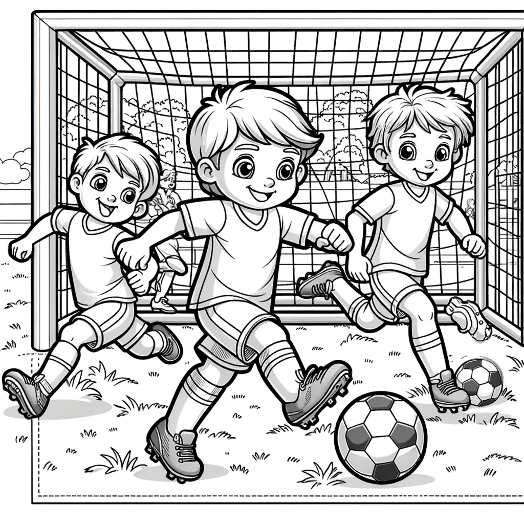 Drei energetische Kinder laufen mit dem Fußball aufs Tor zu - ein spannendes Ausmalbild voller Action.