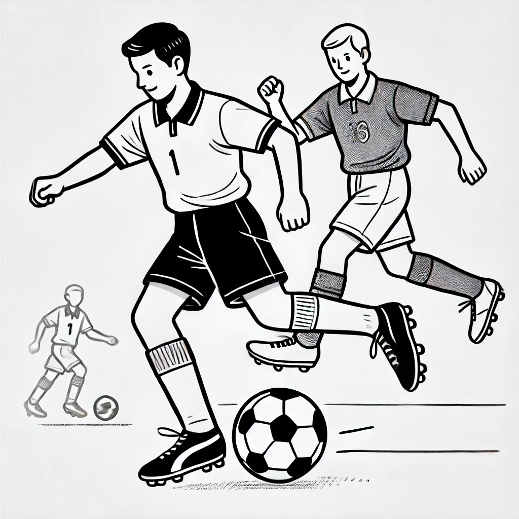Dieses Ausmalbild zeigt einen aufregenden Moment auf dem Fußballfeld, in dem zwei Spieler eifrig darum kämpfen, den Ball zu kontrollieren. Mit entschlossenen Gesichtern und schnellen Bewegungen bringen sie die Spannung eines echten Fußballspiels zum Ausdruck.