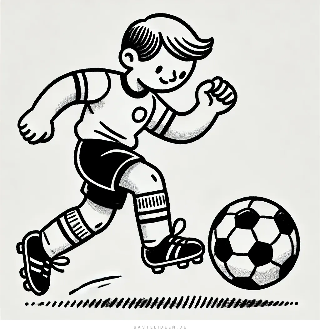 Dieses Ausmalbild zeigt einen jungen Fußballspieler, der voller Energie dem Ball hinterherjagt und bereit ist für seinen nächsten großen Spielzug. Mit konzentriertem Blick und selbstbewusstem Schritt verkörpert er den Geist eines entschlossenen Athleten.