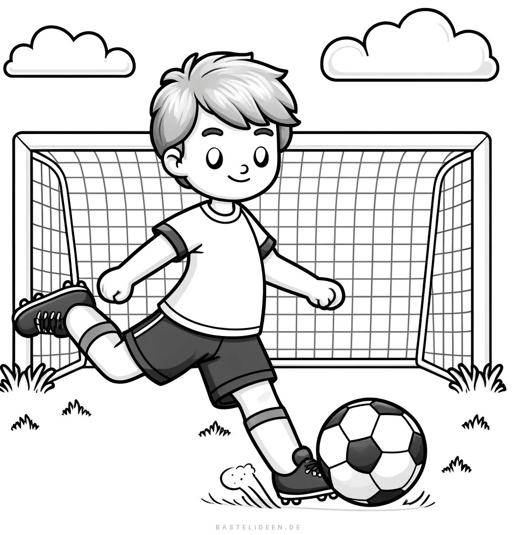 Auf diesem tollen Ausmalbild siehst du einen jungen Fußballspieler, der bereit ist, den Ball ins Tor zu schießen. Mit einem großen Lächeln und Entschlossenheit in den Augen steht er perfekt vor dem Netz und zeigt seine Begeisterung für das Spiel.
