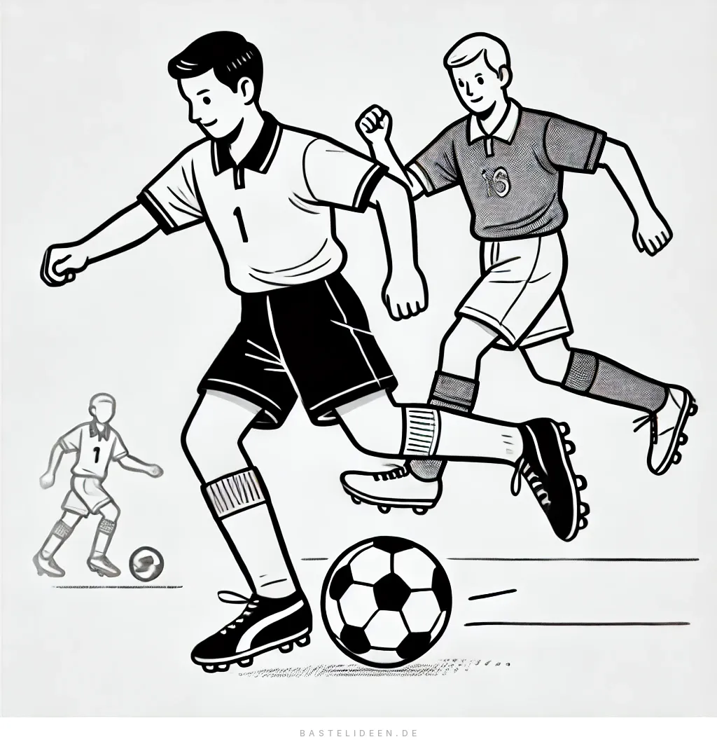 Dieses Ausmalbild zeigt einen aufregenden Moment auf dem Fußballfeld, in dem zwei Spieler eifrig darum kämpfen, den Ball zu kontrollieren. Mit entschlossenen Gesichtern und schnellen Bewegungen bringen sie die Spannung eines echten Fußballspiels zum Ausdruck.