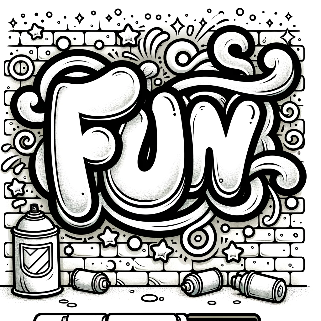 Bringe eine Portion Kreativität in deinen Tag mit diesem lebhaften Graffiti-Ausmalbild! Es zeigt das mutige Wort FUN in einem dynamischen Graffiti-Stil, umgeben von Sternen, Wirbeln und Spraydosen.
