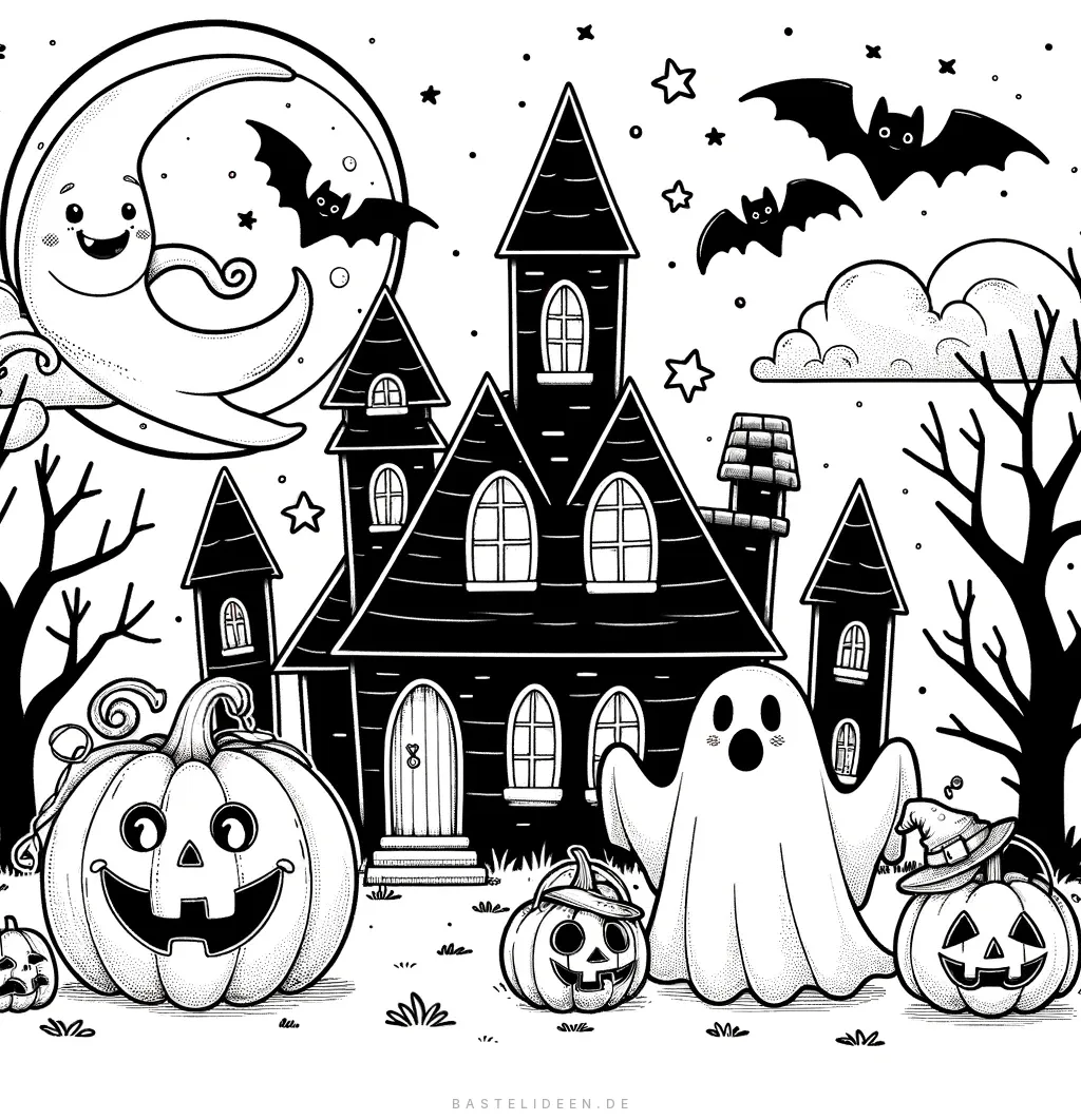Das Bild zeigt eine gruselige Halloween-Szene mit einem Spukhaus im Mittelpunkt, umgeben von Kürbislaternen, einem Geist und Fledermäusen, die am Nachthimmel fliegen. Der fröhliche Mond verleiht der Szene einen verspielten Touch und macht sie sowohl unheimlich als auch lustig.