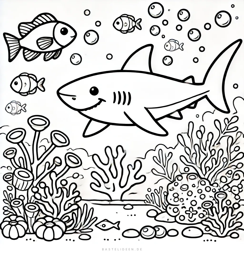 Dieses entzückende Ausmalbild zeigt einen fröhlichen Hai, der durch eine Unterwasserszene schwimmt, begleitet von verschiedenen Fischen und Meerespflanzen. Das einfache, aber charmante Design ist perfekt für Kinder und Erwachsene, die das Meeresleben lieben.