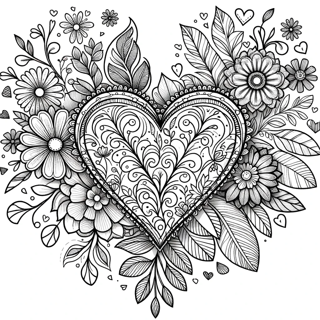 Ein wunderschönes Herz-Ausmalbild mit kunstvollen floralen Mustern und dekorativen Blättern drumherum.