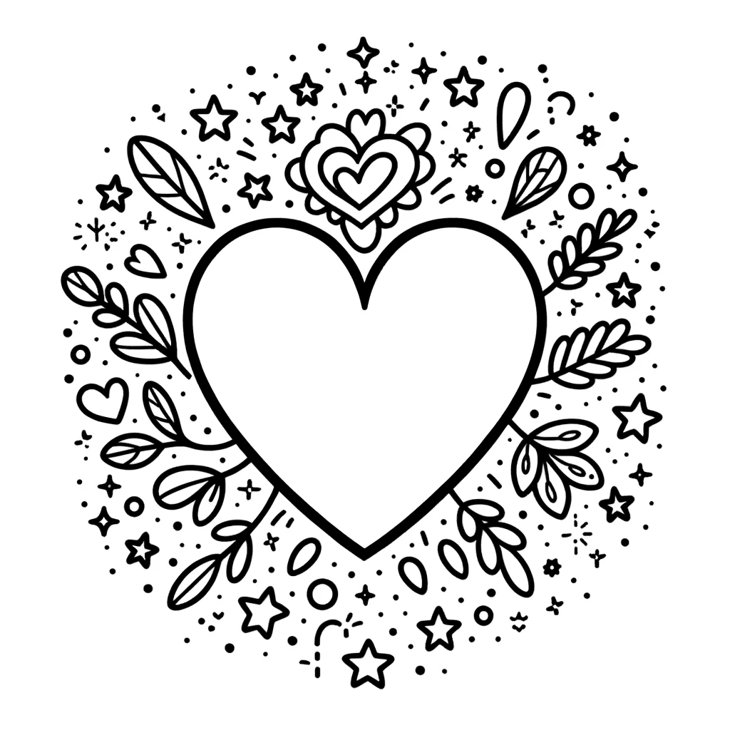 Ein schlichtes Herz in der Mitte, umrahmt von verspielten Sternen, Blättern und niedlichen Doodle-Elementen.