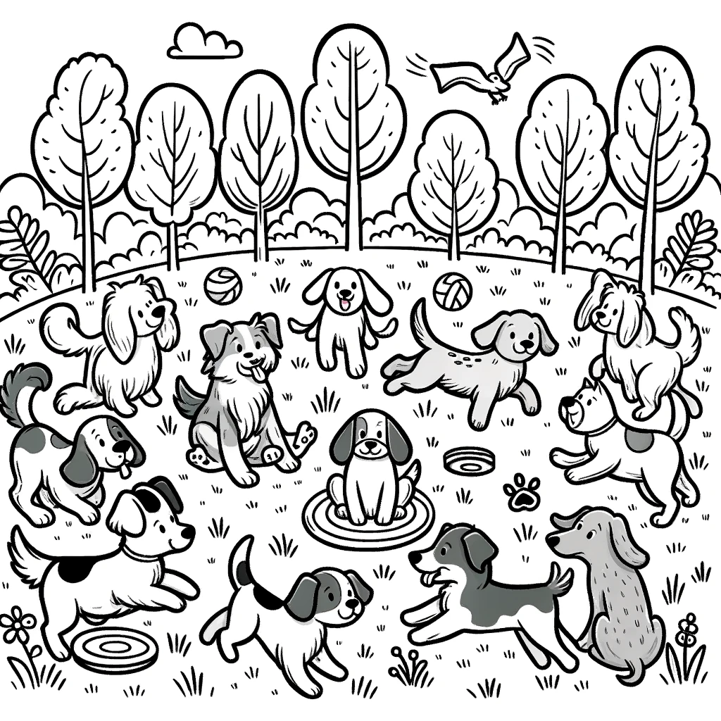 Ein fröhliches Ausmalbild mit vielen Hunden, die gemeinsam im Park spielen, umgeben von Bäumen, Bällen und Frisbees. Perfekt für alle Hundeliebhaber.