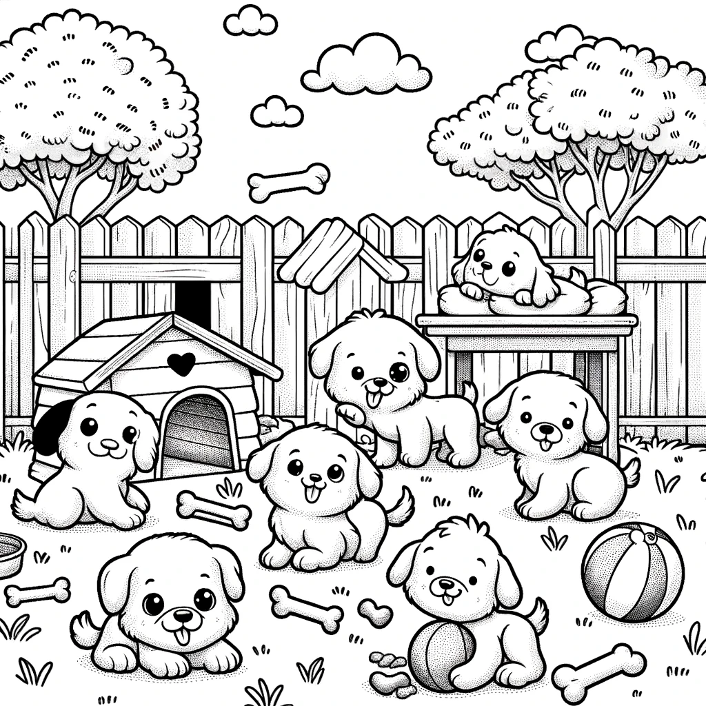 Entzückende Welpen toben im Garten zwischen Hundehütten, Knochen und Spielzeug. Ein bezauberndes Ausmalbild für Kinder, die Welpen lieben.