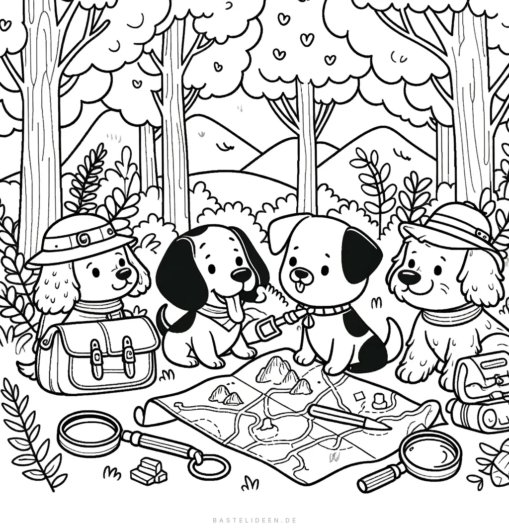 Niedliche Hunde auf Entdeckungstour im Wald mit Rucksäcken, Landkarte und Lupe. Ein spannendes Abenteuer-Ausmalbild für kleine Entdecker.