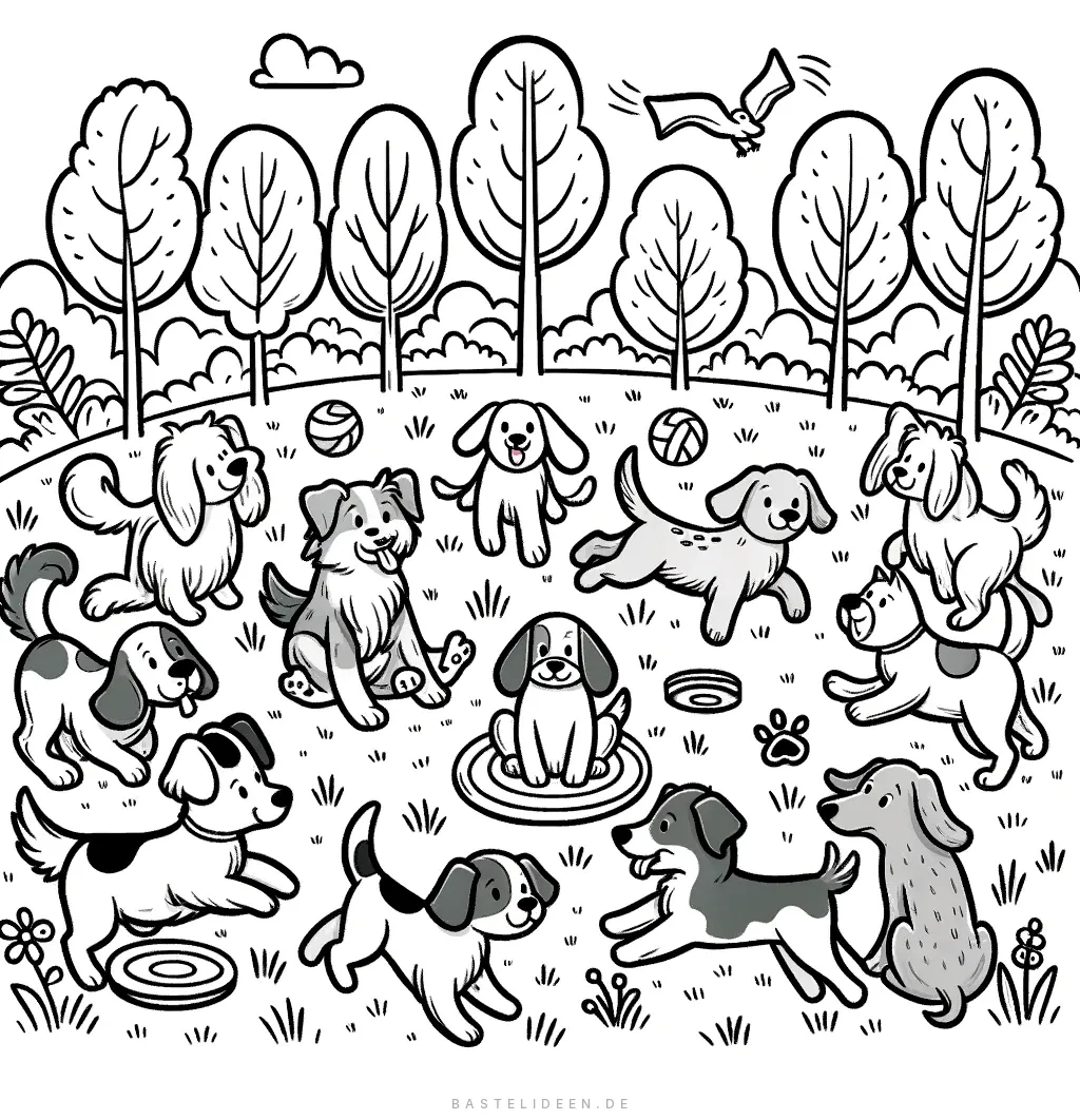 Ein fröhliches Ausmalbild mit vielen Hunden, die gemeinsam im Park spielen, umgeben von Bäumen, Bällen und Frisbees. Perfekt für alle Hundeliebhaber.