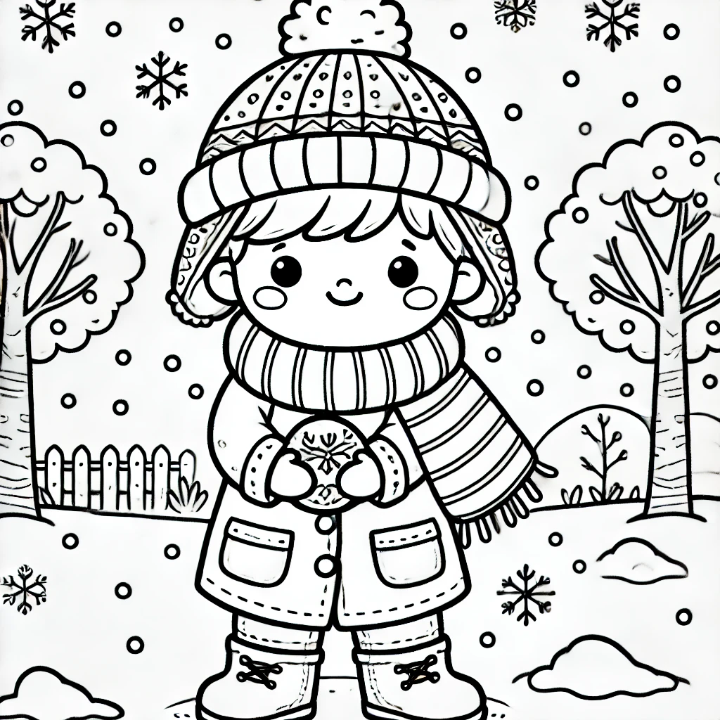 Dieses niedliche Ausmalbild zeigt ein fröhliches Kind, das sich in warme Winterkleidung gehuellt hat, einen Schneeball hält und den verschneiten Tag geniesst. Die Szene ist komplett mit sanft fallenden Schneeflocken und schneebedeckten Bäumen.
