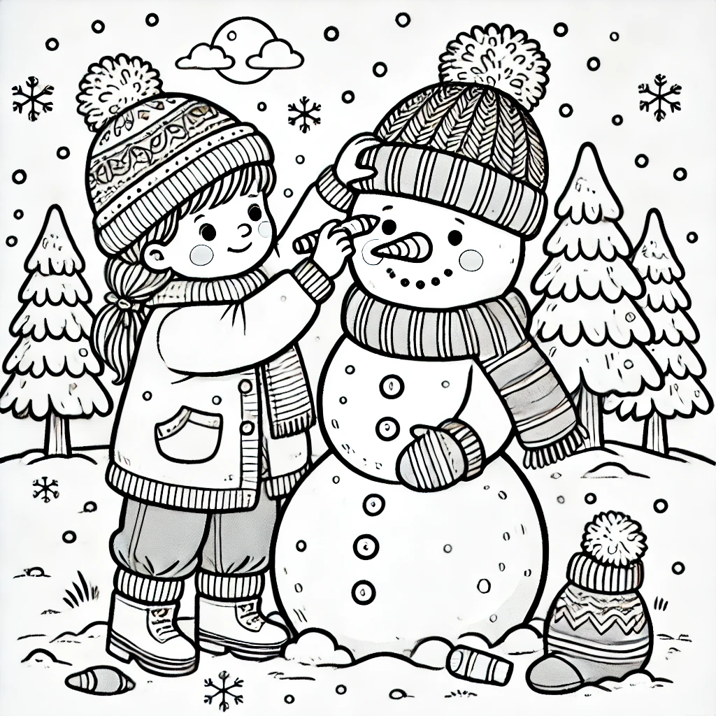 Dieses entzückende Ausmalbild fängt die fröhliche Winterstimmung ein, während ein Kind freudig einen Schneemann baut und ihm eine Karottennase und Knopfaugen hinzufuegt. Die schneebedeckten Bäume und Schneeflocken verleihen der Szene Wärme und Charme.