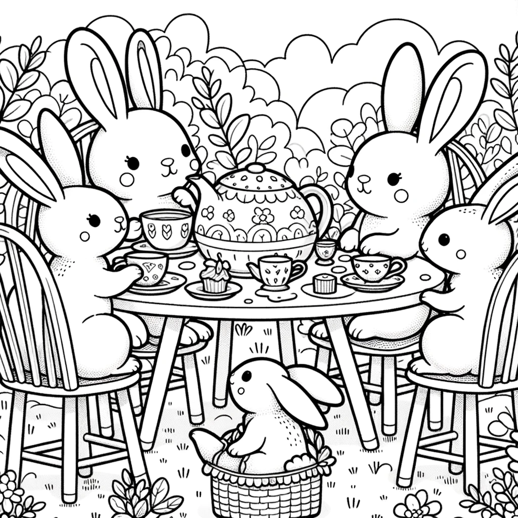 Eine entzückende Malvorlage von Hasen, die draußen im Garten ein Teekränzchen abhalten.